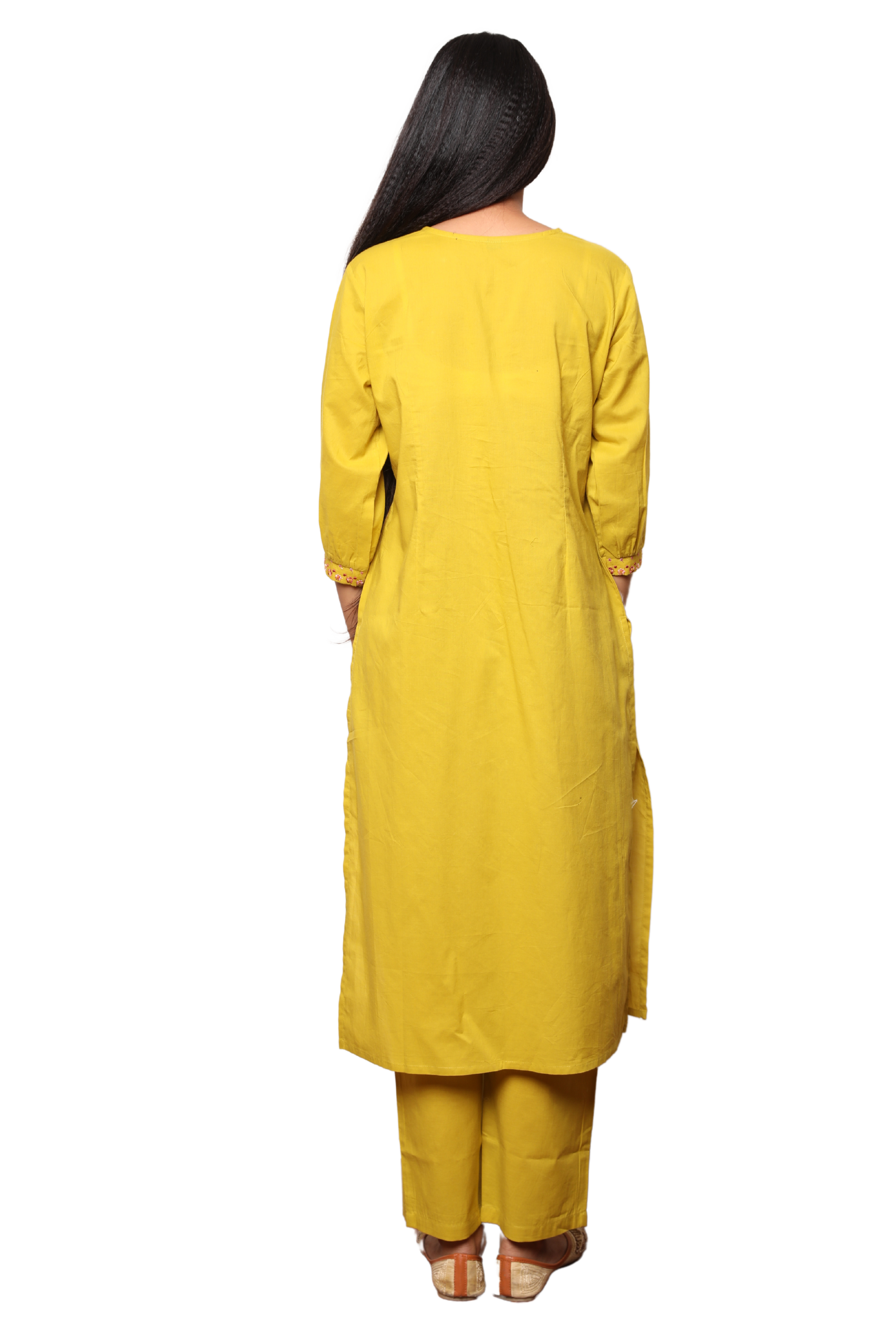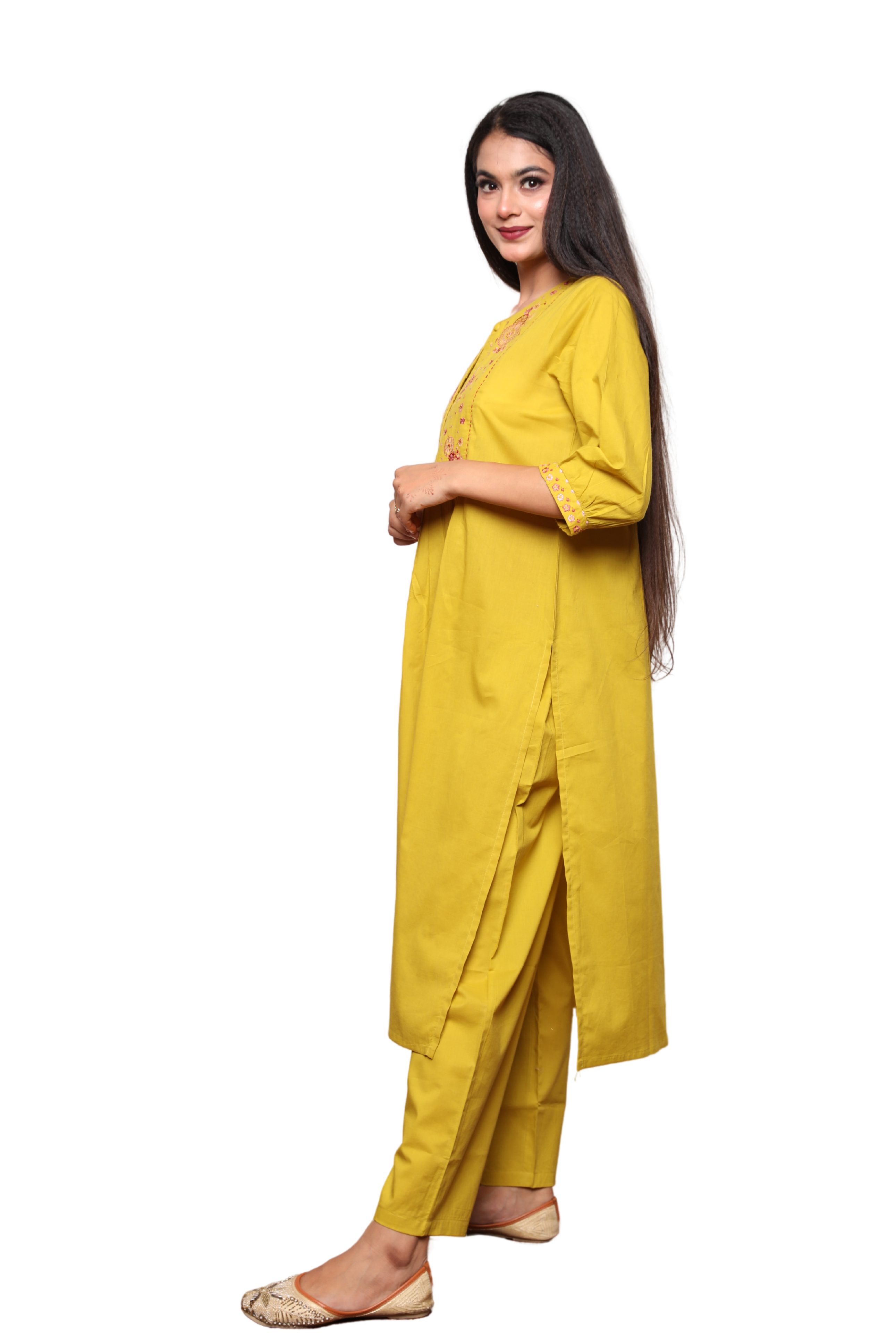 Effortlessly elegant and thoughtfully designed, this 2-piece ethnic set features a beautifully tailored Nyra-cut kurta with intricate embroidery on the yoke and sleeves, offering a perfect blend of traditional detail and modern sophistication. The kurta’s side slit adds a flattering silhouette, while the coordinated pants come with functional side pockets, ensuring all-day comfort without compromising on style.
